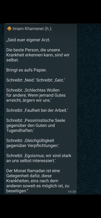 "Ich bitte euch, dass ihr genauso wie ihr auf den Gebets- und Fastendienst achtet, auch darauf achtgebt, euch der üblen Nachrede und Hetze, Verleumdung und Äußerungen von Dingen, von denen ihr keine sichere Kenntnis besitzt, zu enthalten. "